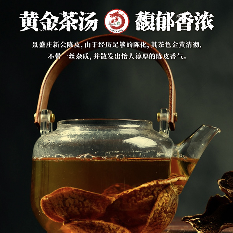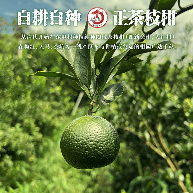景盛庄从清代开始在东甲村种植纯种圈枝茶枝柑(即新会柑/大红柑)在梅江、天马、茶坑等一线产区参与种植或营运的柑园广达千畒。从栽植、摘果、选果、开皮、生晒、陈化、返晒等工序都依足传统古法执行,宁愿付出更多心力都要做出正宗陈皮。