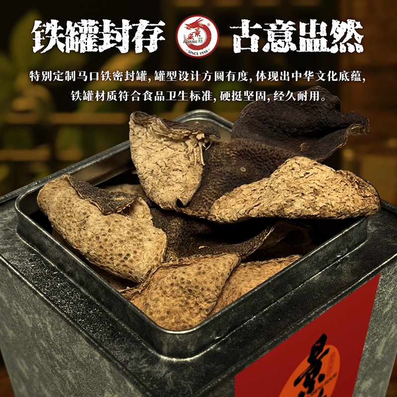 景盛庄新会陈皮,由于经历足够的陈化,其茶色金黄清彻,不带一丝杂质,并散发出怡人淳厚的陈皮香气。特别定制马口铁密封罐,罐型设计方圆有度,体现出中华文化底蕴,铁罐材质符合食品卫生标准,硬挺坚固,经久耐用。